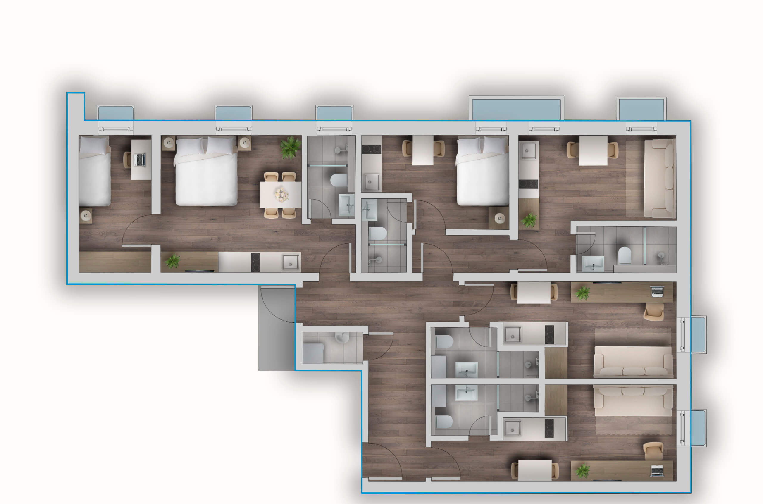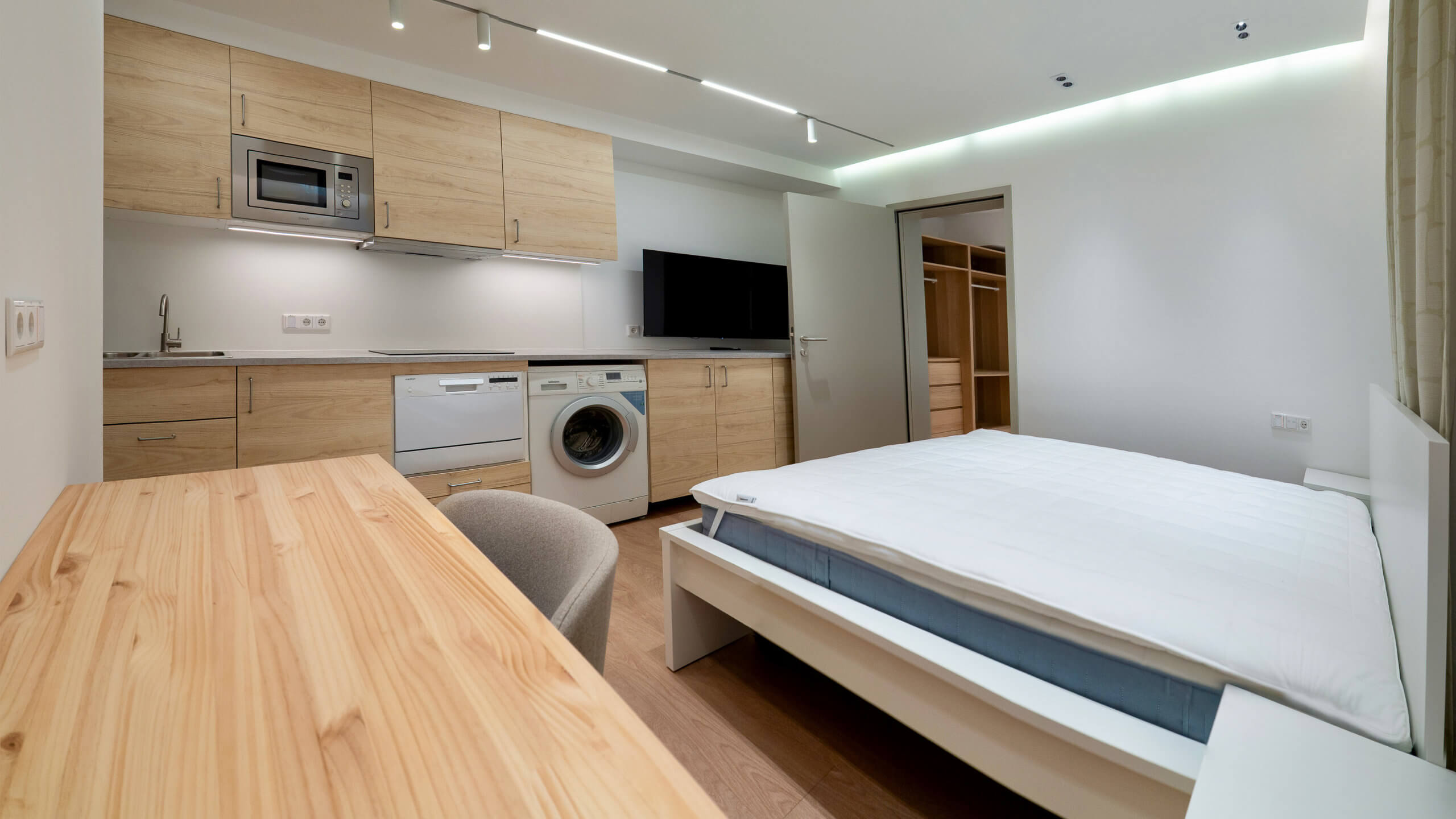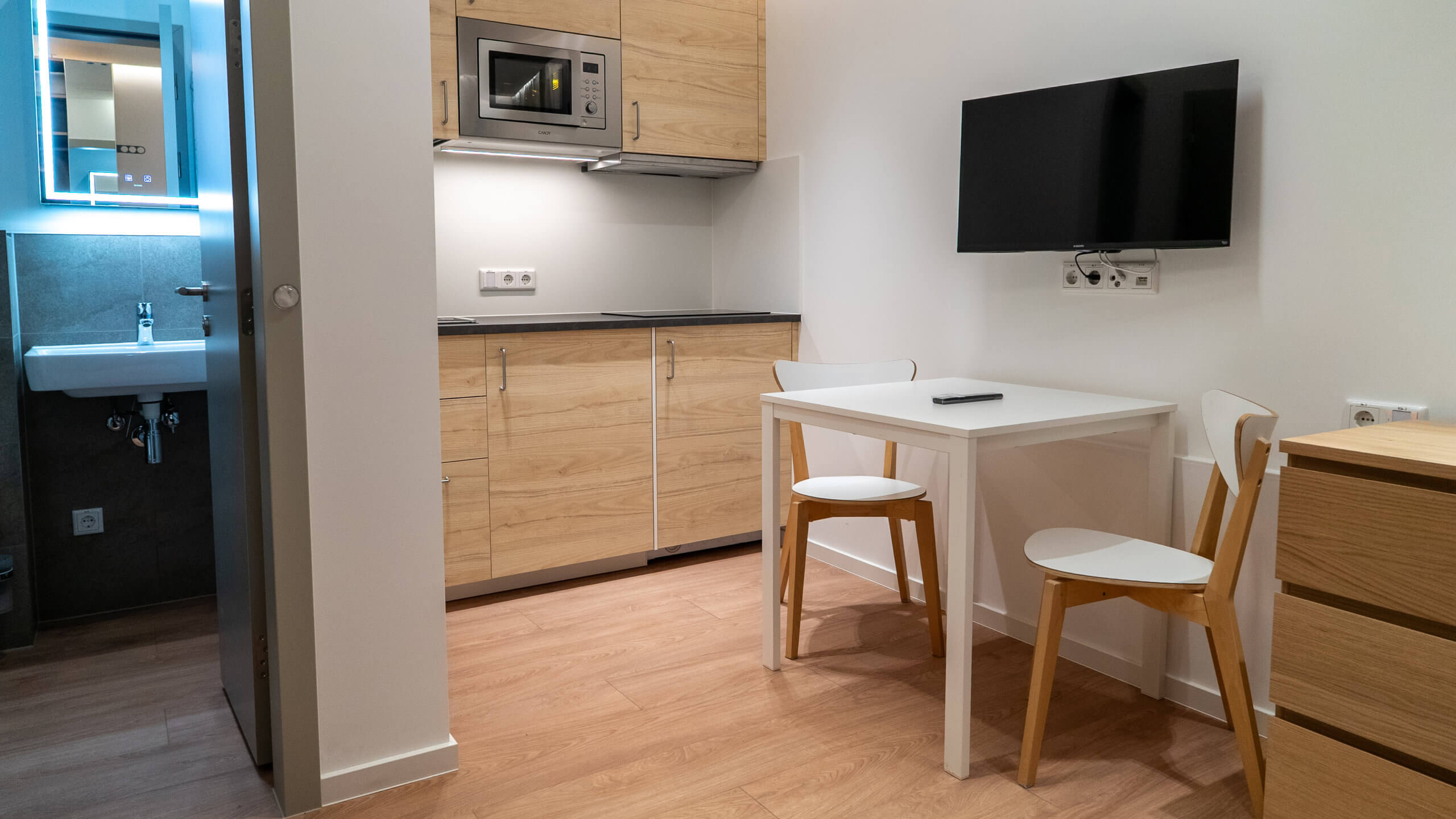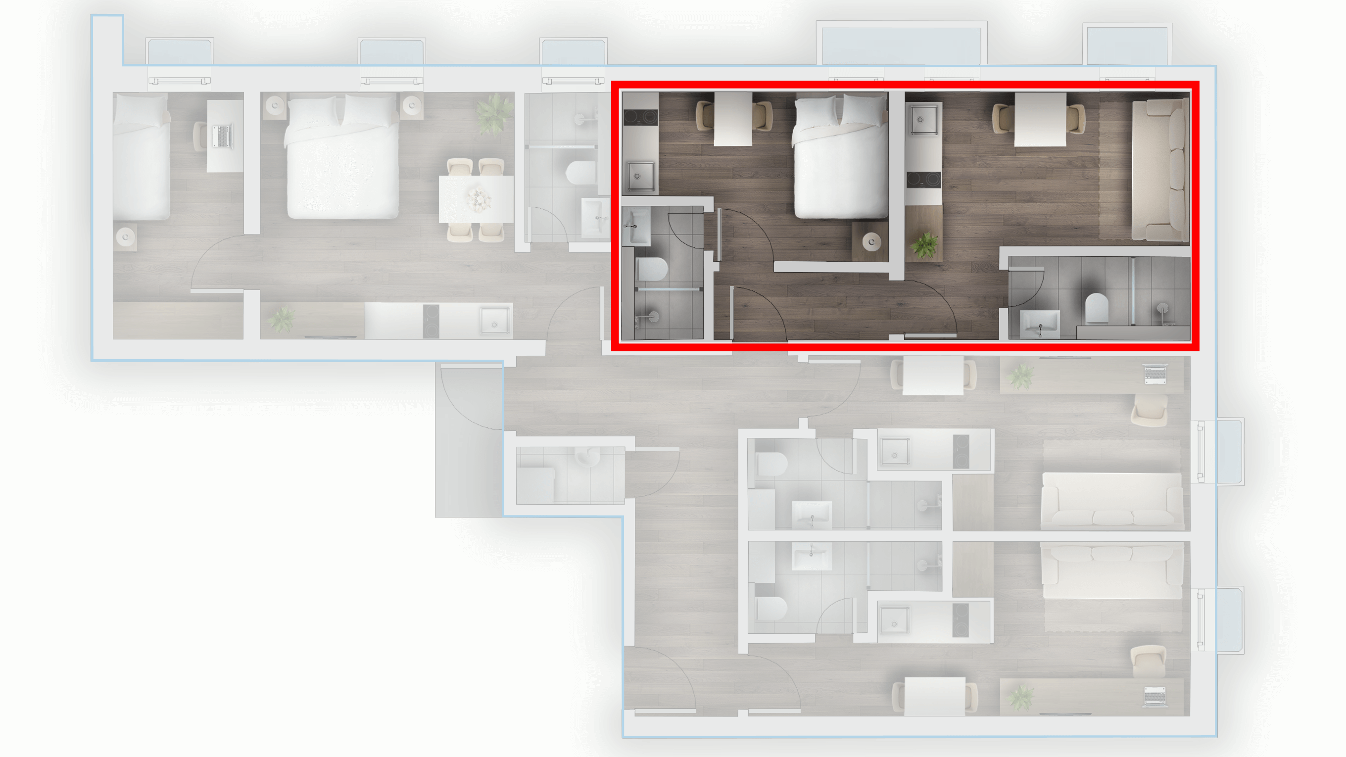 Der hier dargestellte Apartmenttyp steht exemplarisch für die gestalterische und funktionale Qualität aller Einheiten: effiziente Grundrisse, hochwertige Materialien und eine sorgfältig abgestimmte Ausstattung schaffen ein angenehmes Wohngefühl – geeignet für kurze Aufenthalte ebenso wie für längere Nutzungszeiträume.