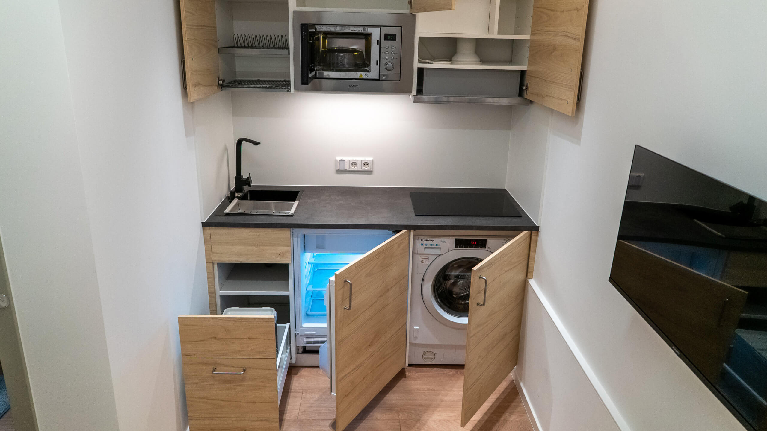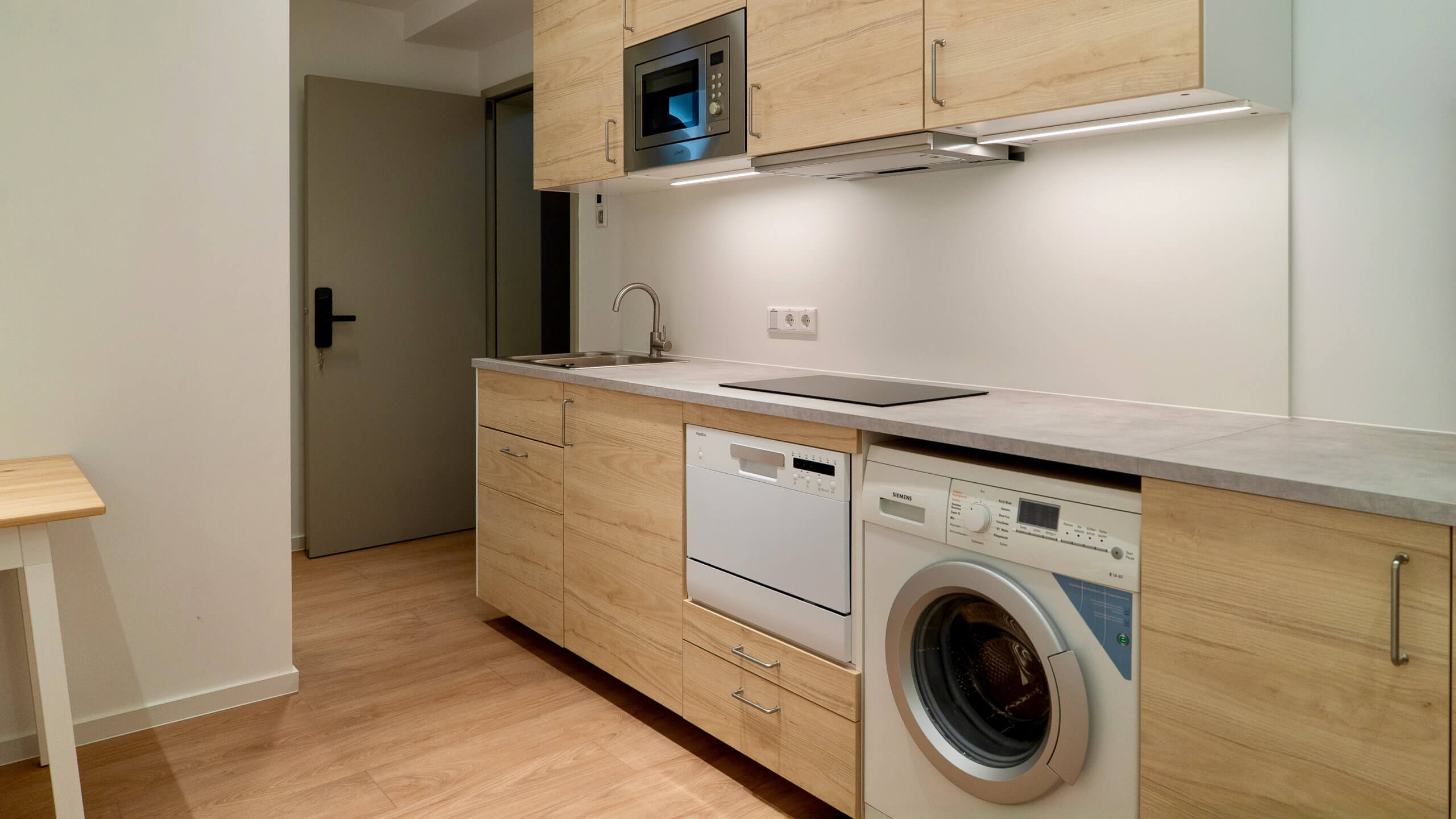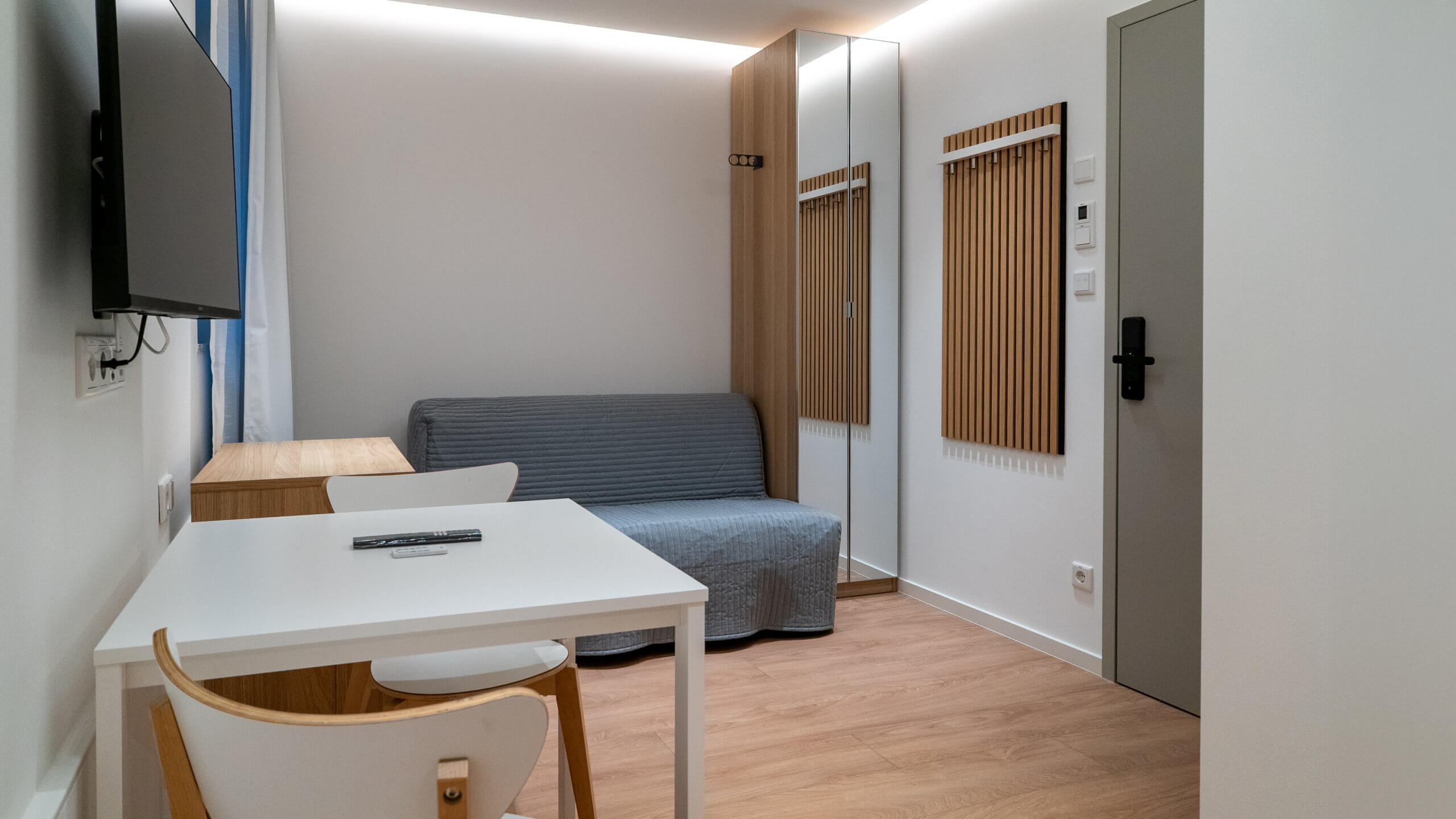 Kompakt, besonders effizient geplant und dennoch vollständig ausgestattet. Die wirtschaftlichste Option im Mini-Hotel – ohne Verzicht auf Funktionalität.